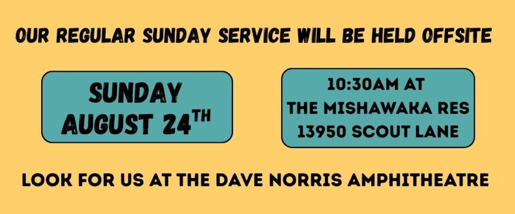 This service is off-site at the Mishawaka Res, where we will have an outdoor service. We will take advantage of the beauty of the outdoors to reflect on and experience the wonders of nature and what we can learn from it.